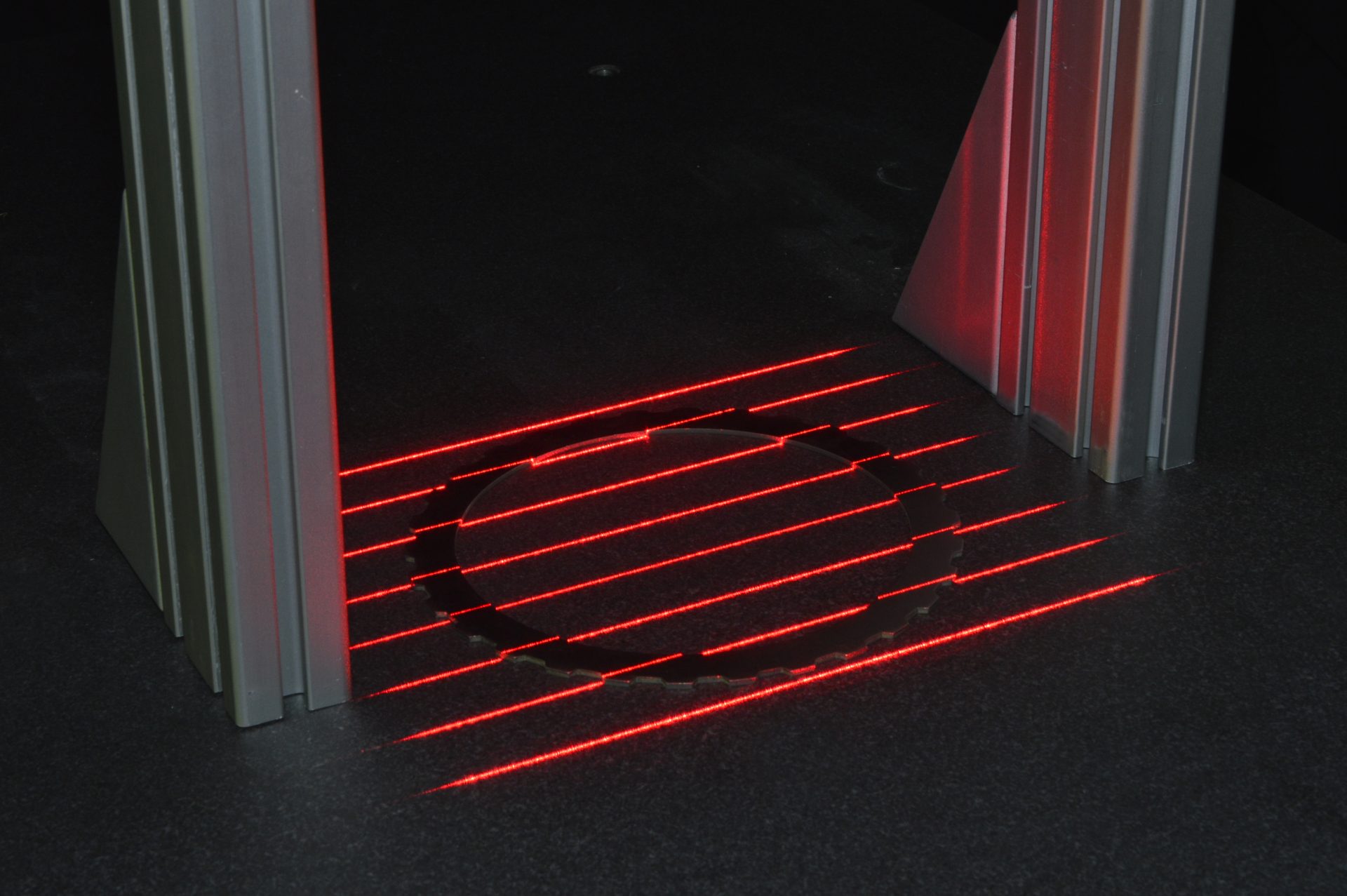 Several laser lines are projected onto the part to be inspected – for which flatness is critical – while it is transported past the measuring station. Two cameras record these lines. The image processing software almost instantaneously converts the line tracks into precise flatness values over the entire surface of the test part. The exposure time is reduced by using multiple lines, making the system immune to vibrations of the part on the conveyor.